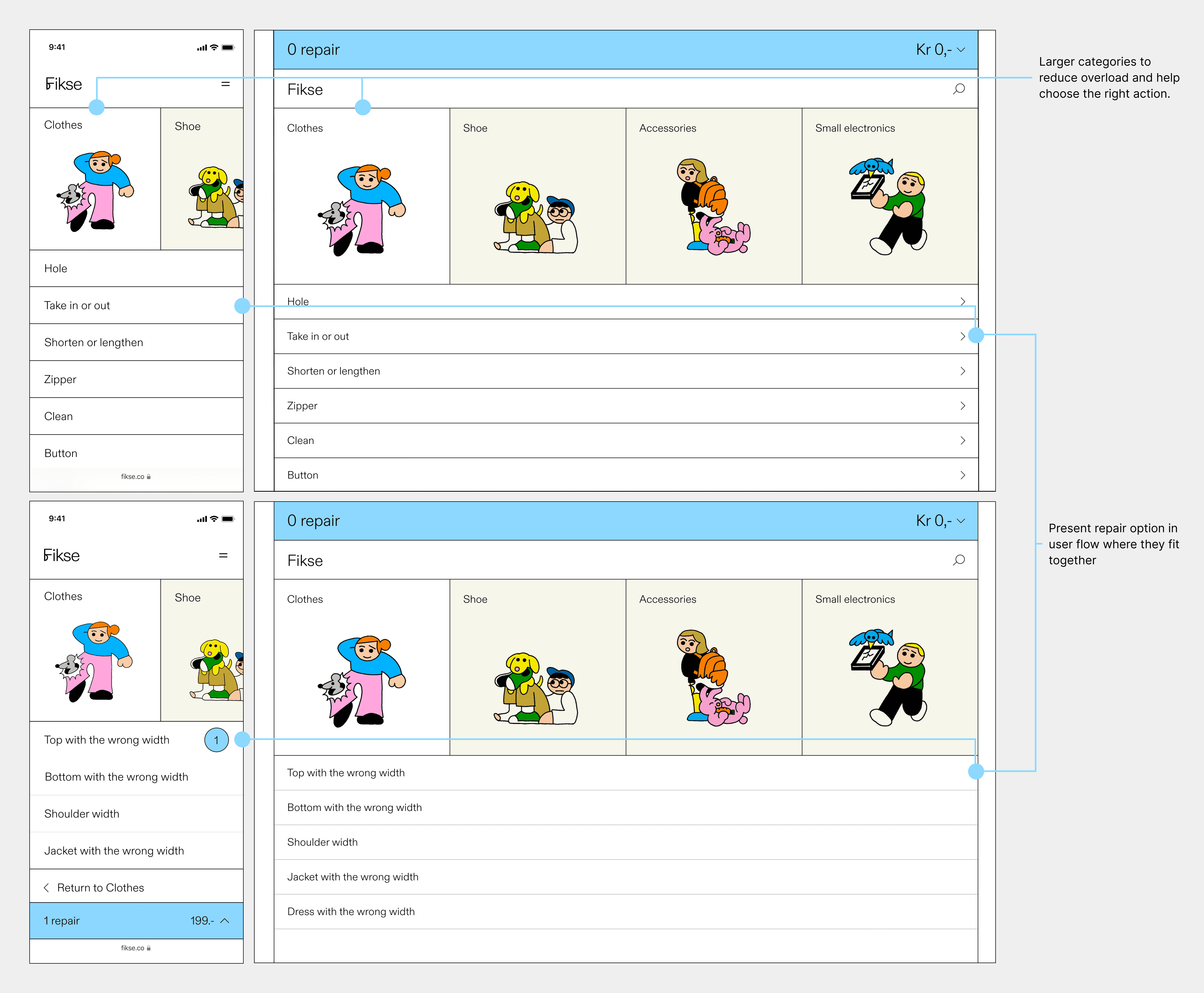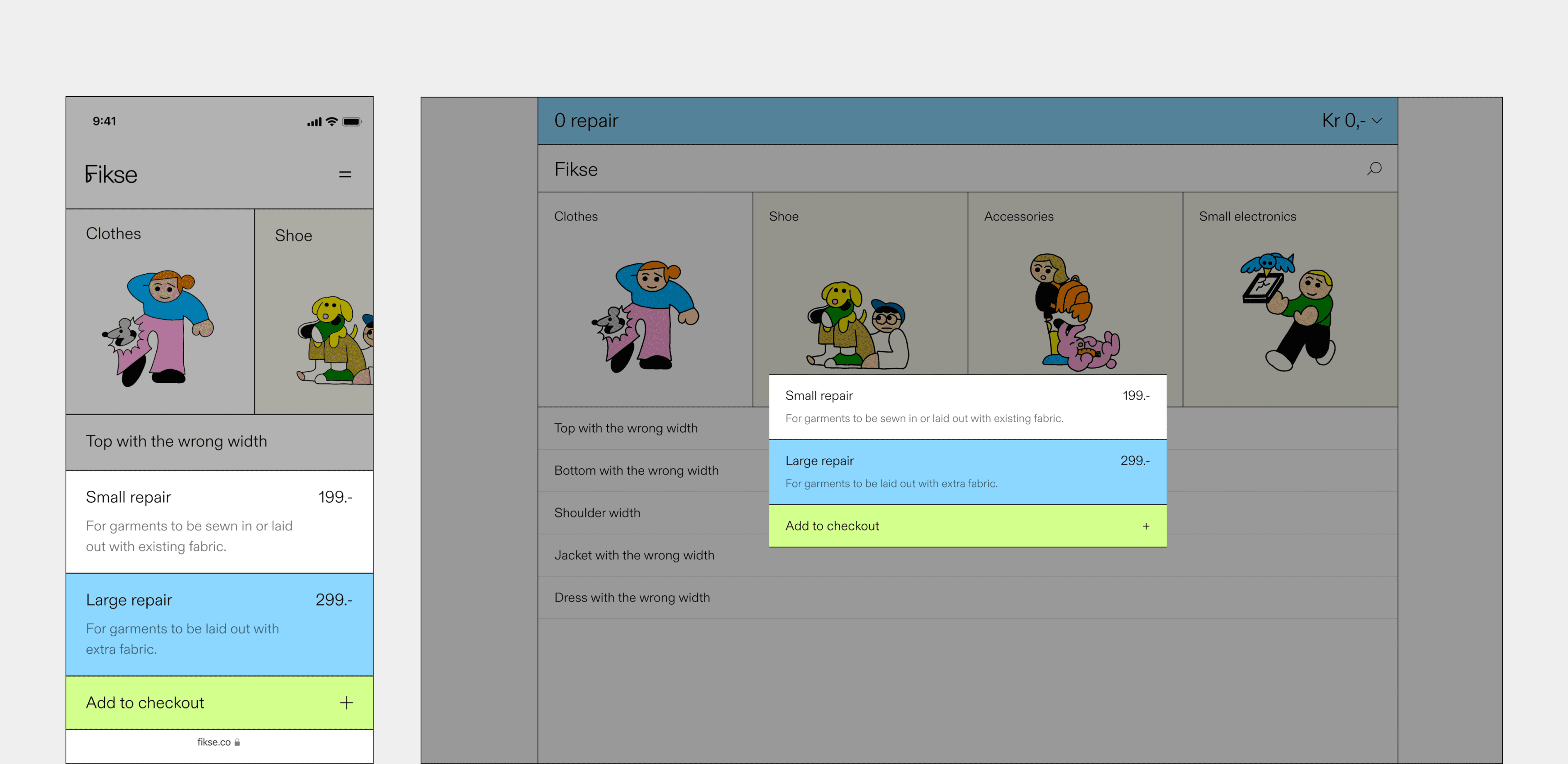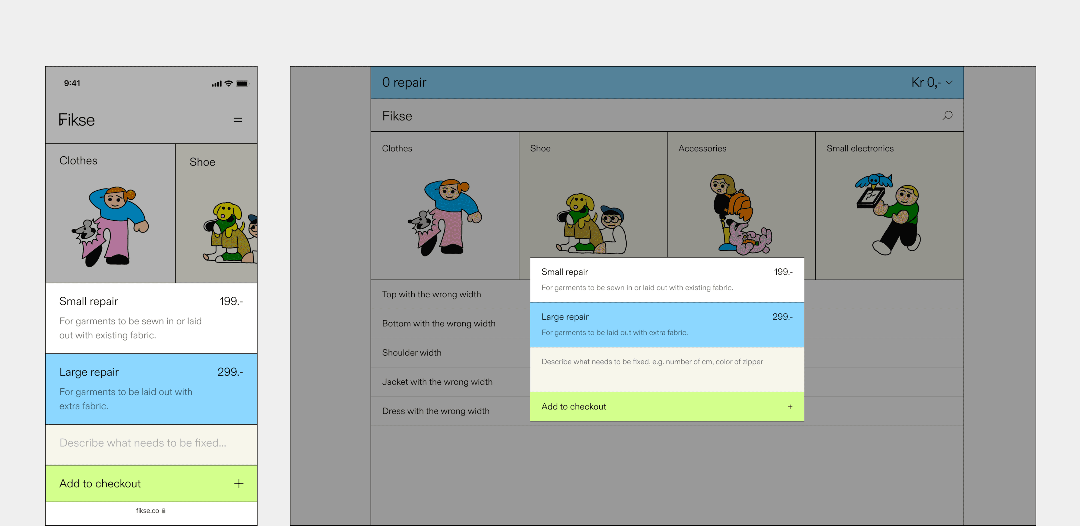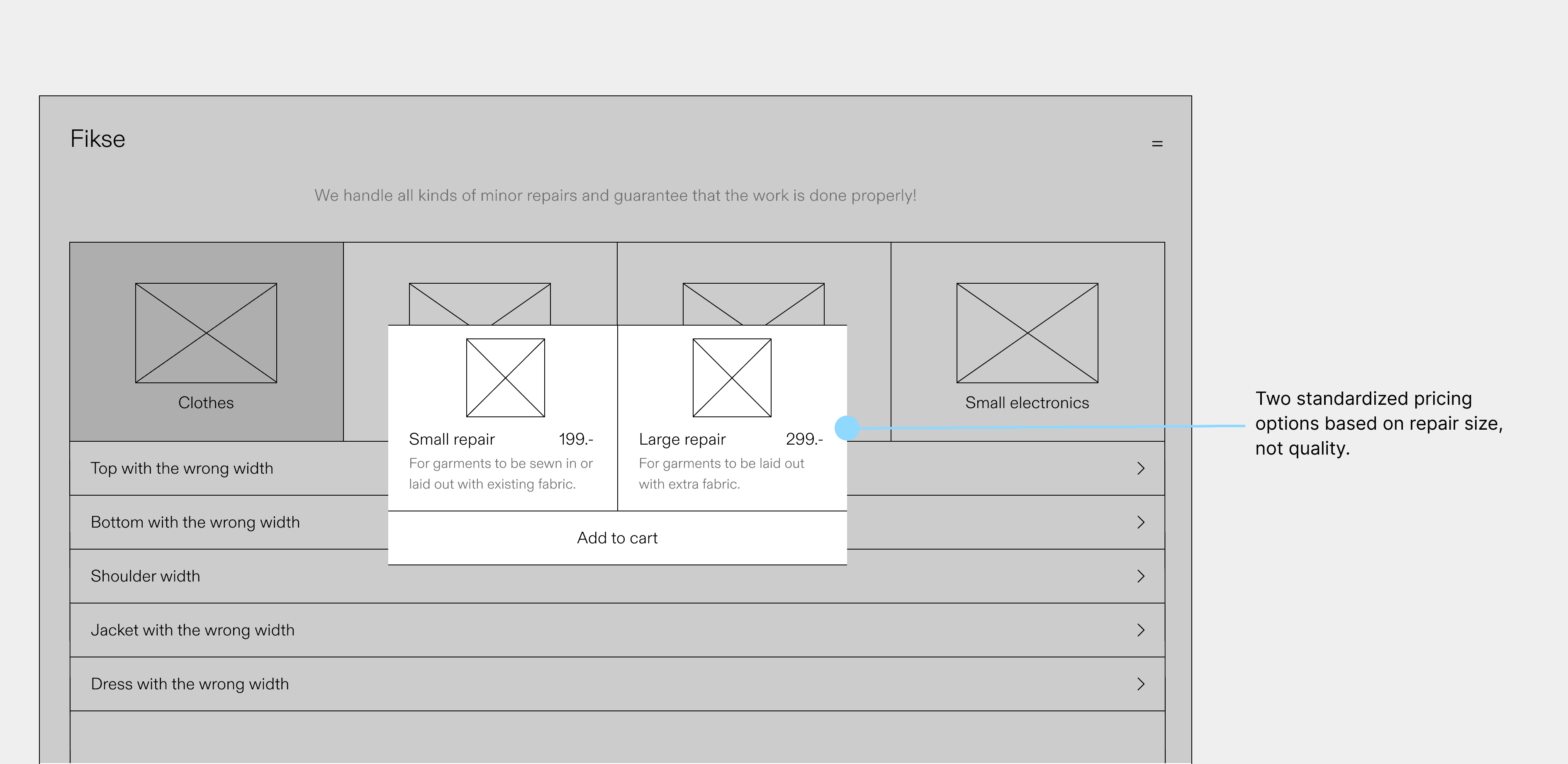 Implemented two standardized repair pricing models with information about each repair and a visual highlight when selected.