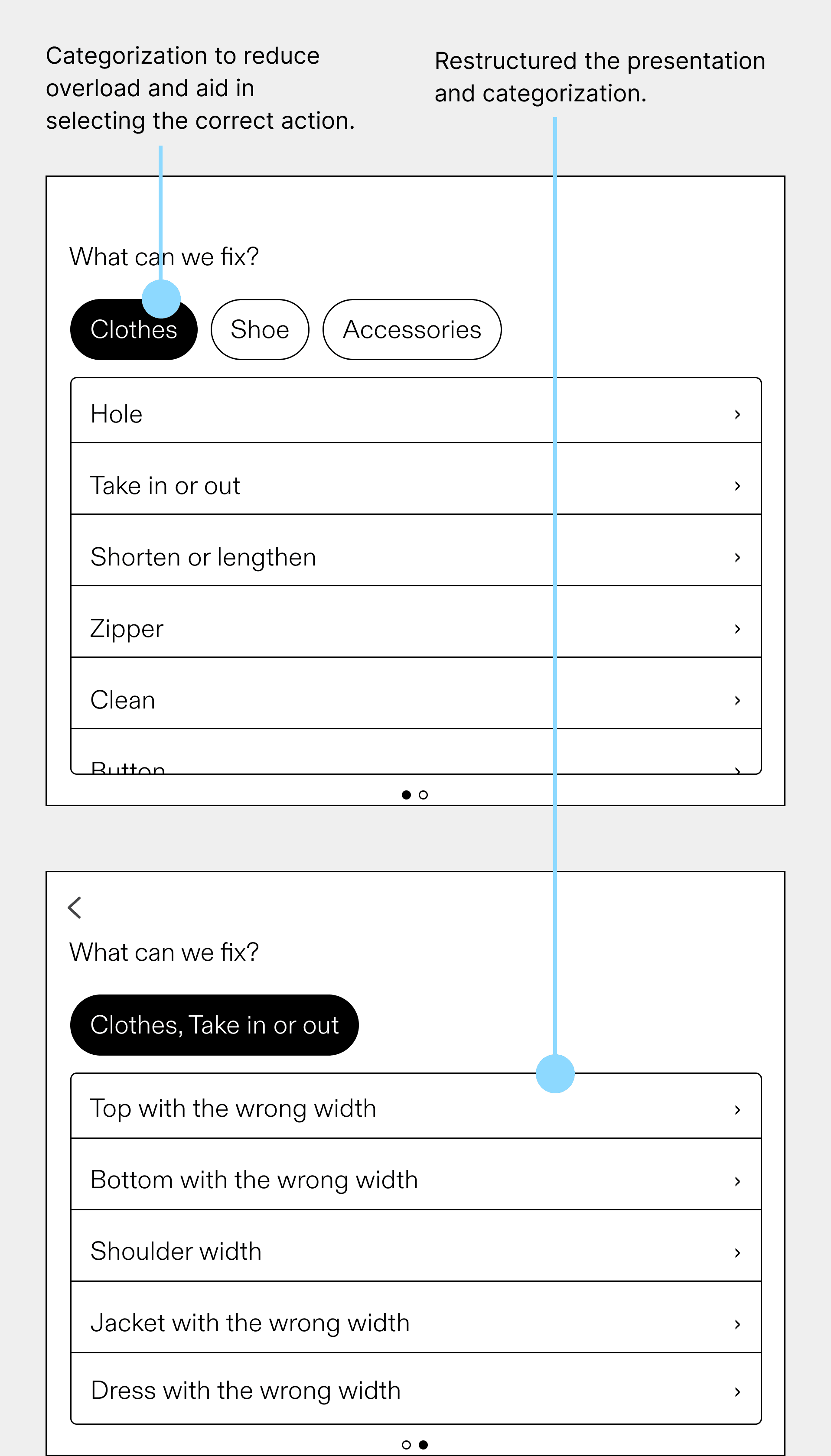 To determine the best way to help users understand repair options, we conducted a workshop to develop an ideal user flow and information architecture. It became clear that we needed to categorize options, group repair options where they fit together, and present the repair flow so that users can easily understand which repair option suits their needs.