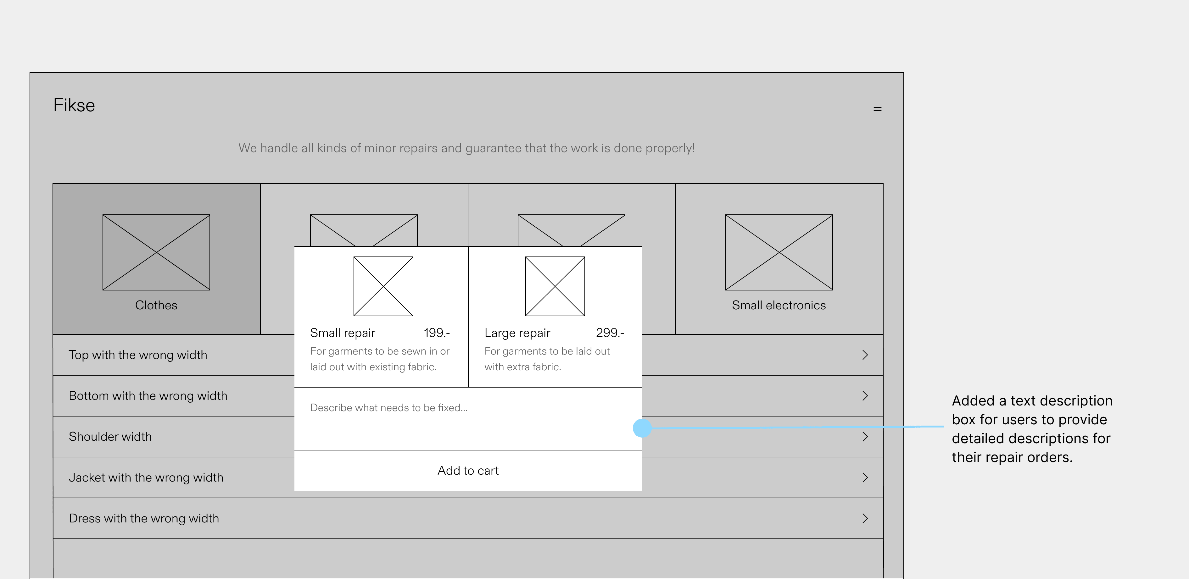 Users can provide a detailed description, specifying the relevant information about the issue with the garment to the repairer. The previous design did not have a user repair description.